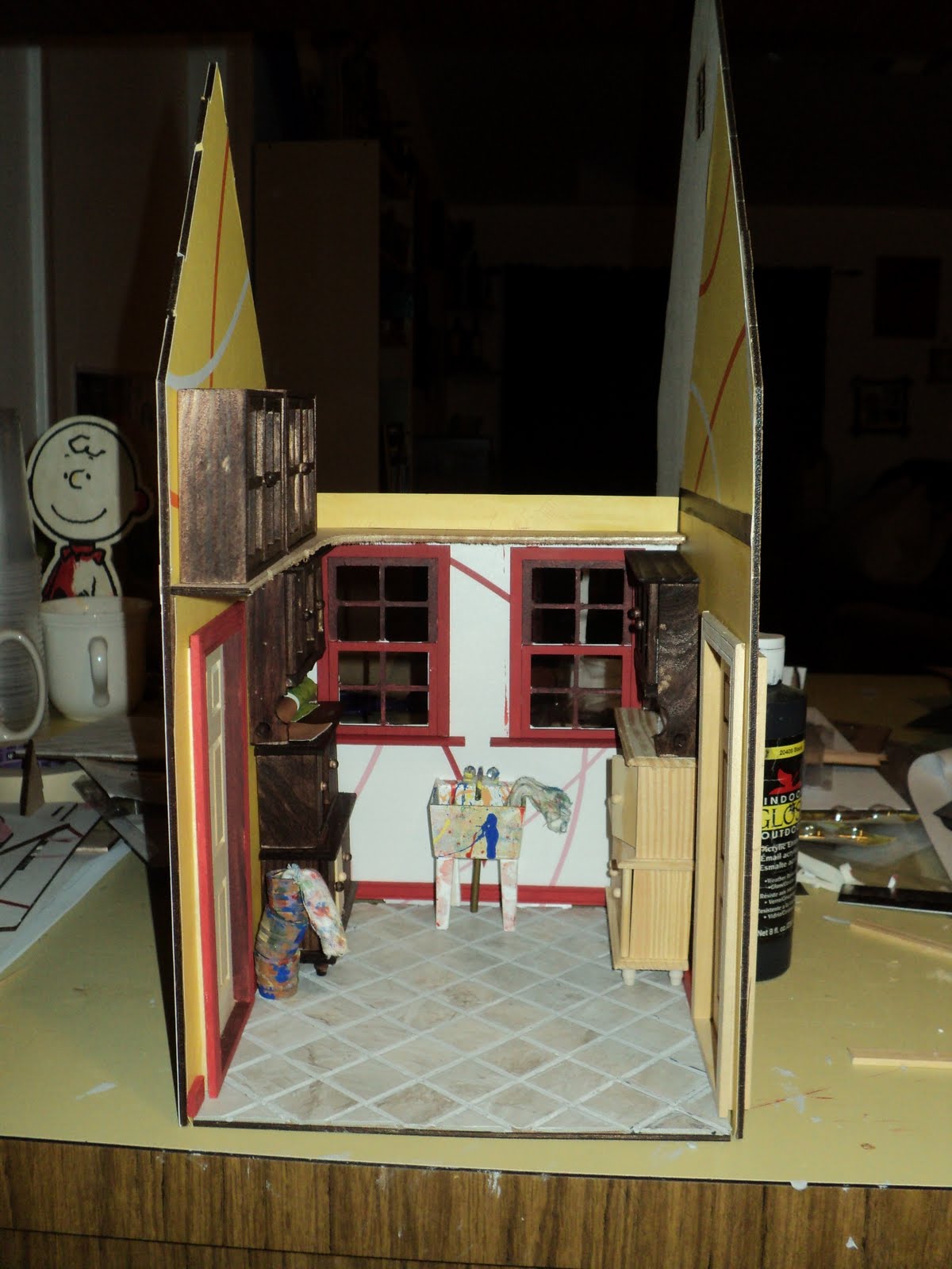 Now the doors are cut out and windows installed. There is also a mock up (straw) for the spiral staircase. The second floor had been cut away to make the rooms bigger and airier, along with the purpose of providing sense to the skylights. They just seemed silly to be lighting up a floor right there! A little bit of the floor was left to help maintain structural integrity and to have a built in shelf to hold extra supplies. You can see a few of the furniture pieces tacked up temporarily as I play with the layout.
